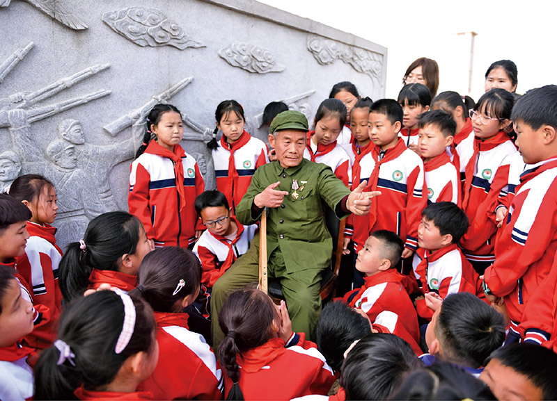 近年来,山东实施红色基因传承工程,优化英模人物宣传学习机制,建强用好各级各类教育基地,推动全社会崇尚英雄、缅怀先烈、争做先锋。图为退伍军人为中小学师生讲述革命历史故事。 山东省委宣传部供图