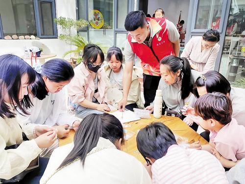 5月5日上午,“泉城好人”田叶龙(穿红衣者)和志愿者们通过沉浸式体验非遗与公益实践相结合的创新形式,搭建起传统文化传承与爱心传递的桥梁,为青少年带来一场别样的体验。