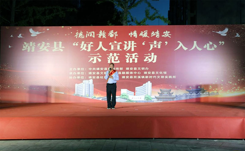 近日,江西省宜春市靖安县在幸福家园广场举行了“好人宣讲 ‘声’入人心”活动,吸引了周边群众驻足观看。活动特别邀请了“四个100”文艺导师陈伟强、非遗导师韩英生和7位好人代表参加,为文化赋能,为活动添彩。