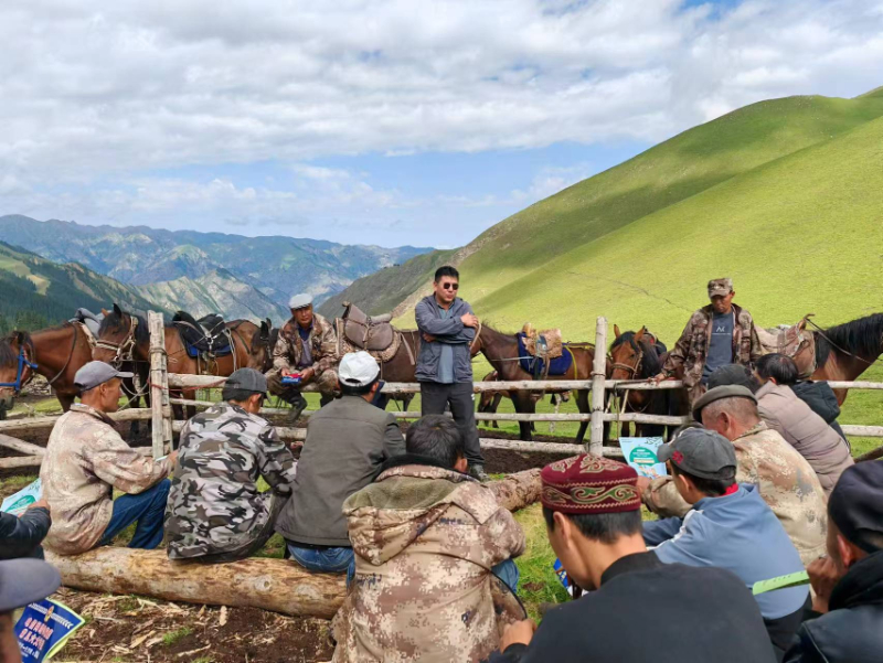 赛力克波力·库万德克(左五)深入博孜阿德尔牧区开展政策宣讲。新疆生产建设兵团文明办供图
