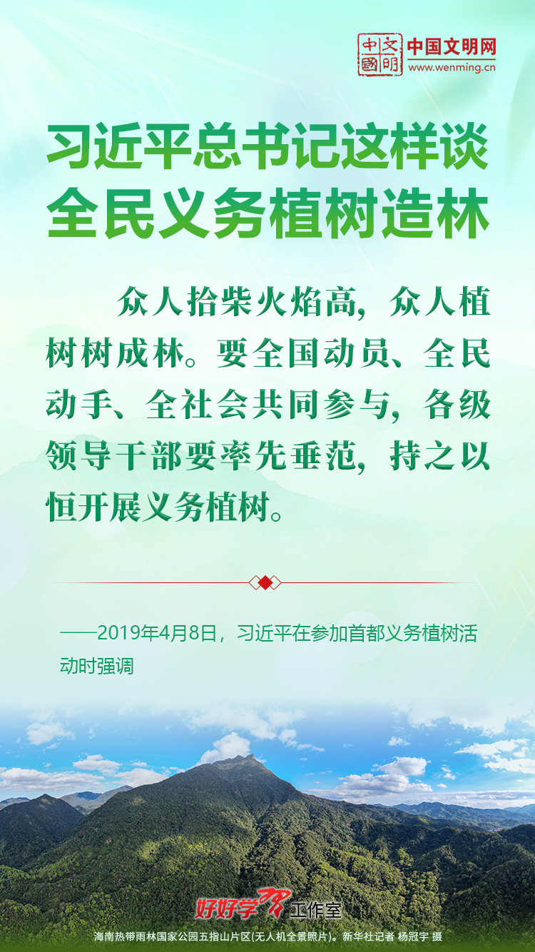 习近平总书记始终关心国土绿化事业。党的十八大以来,习近平总书记每年都参加首都义务植树活动,并发表重要讲话。让我们一起重温习近平总书记关于植树造林的重要讲话精神,积极行动起来,从义务植树做起,植出绿水青山和金山银山,让祖国大地更加绿意盎然、生机勃发。