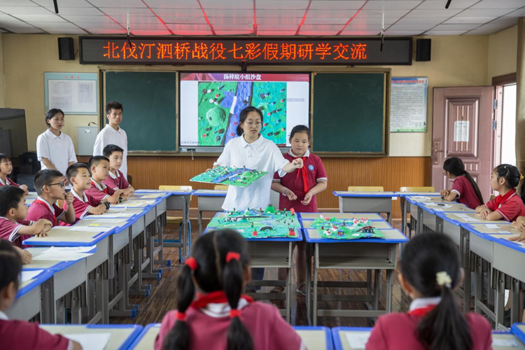 7月23日,咸宁市咸安区汀泗桥镇小学教室里,学生们在对北伐战争汀泗桥战役进行研究学习。新华网 钟奕 摄