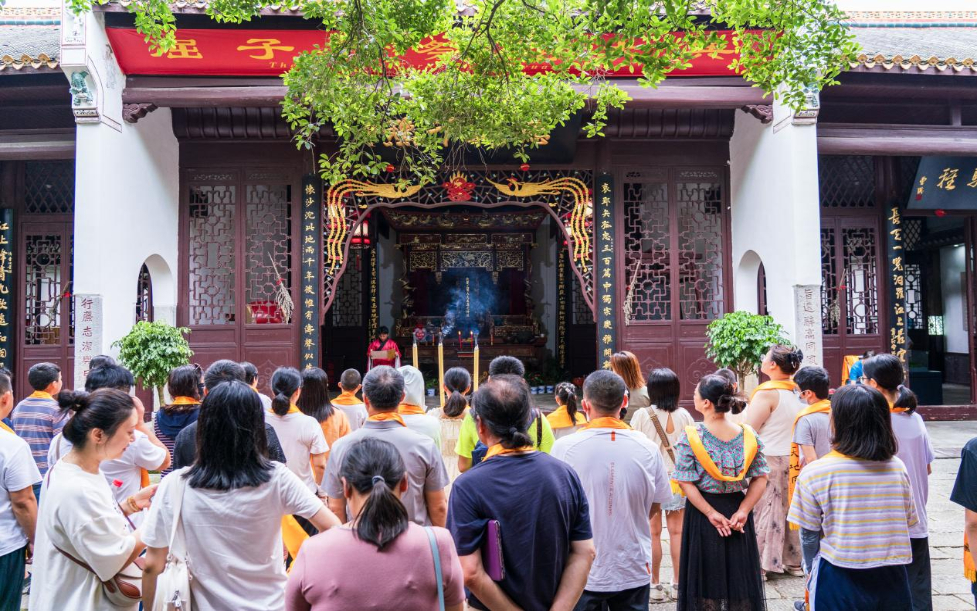 7月14日,湖南省汨罗市屈子文化园内的游客们正在参加祭屈大典活动,拜祭屈原。新华网 钟奕 摄