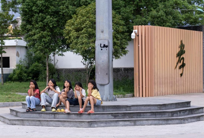 8月30日,在浙江省台州市临海市东塍镇东溪单村,五名小女孩正坐在党群服务中心文化广场上休息。新华网 钟奕 摄
