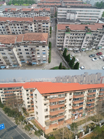 图为如皋市如城街道宏坝社区花港小区老旧小区改造前后对比图。上图为楼宇改造前,下图为改造后。(如皋市文明办供图)