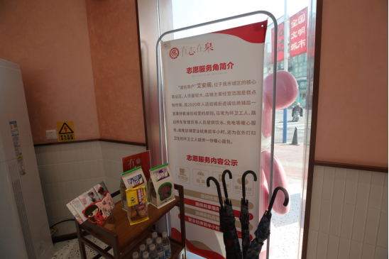文明实践服务街区一家门店店长崔雯雯说:“周边的环卫工人、停车管理员、外卖员都很辛苦,所以每天我们都会在商铺里准备一些面包和水,供他们临时过来歇脚,补充体能。”