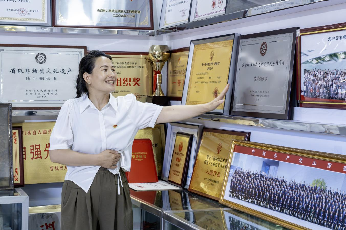 陵川县盲人曲艺宣传队队长靳文莲向采访组介绍团队荣誉室。李剑琦摄
