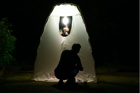 当天色暗下来,山林深处,一盏灯亮起,四周展开白布,不时有飞蛾到来,停留在幕布上。张超蹲在幕布旁,仔细观察着各种飞蛾翅面的斑纹、微微颤动的触角,不时有飞蛾落在他的脸上,还有昆虫爬上裤腿。这是张超进行飞蛾灯诱采集的日常。
