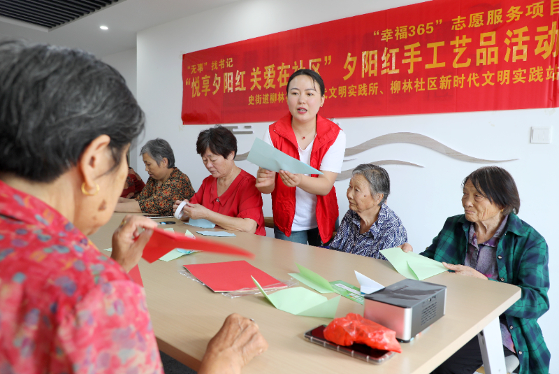 2024年9月28日,安徽省六安市叶集区史河街道柳林社区新时代文明实践站,社区志愿者依托“幸福365”志愿服务项目,组织老年居民开展手工制作活动。新华网发 (田凯平 摄)